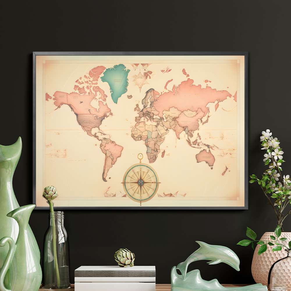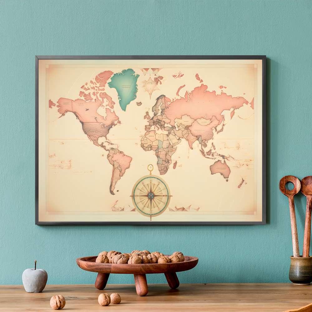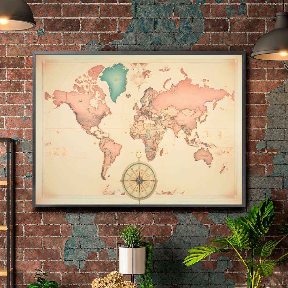 Quadro Decorativo Mapa-Múndi com Bússola em Cores Pastéis