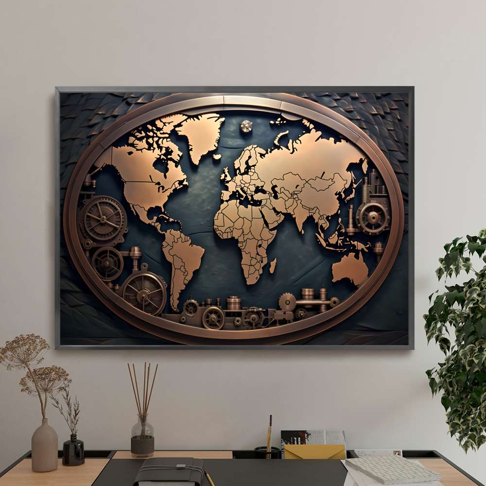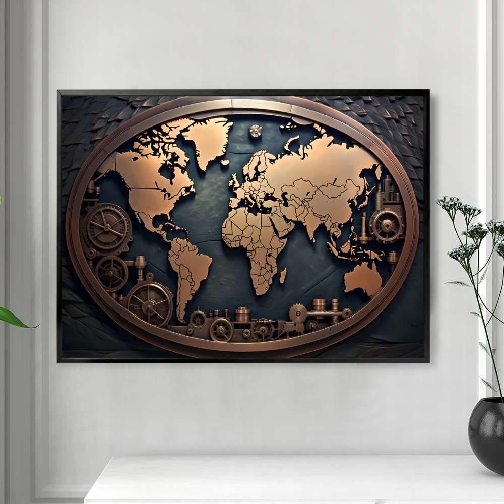 Viaje pelo mundo sem sair de casa com o Quadro Decorativo Mapa-Múndi Rústico Vintage Estilo 3D! Com um design em 3D único, este mapa traz um toque rústico e vintage para a sua decoração, com engrenagens e elementos industriais que evocam charme histórico e artesanal. Adicione personalidade e estilo ao seu ambiente, mostrando a totalidade das terras e dos oceanos do planeta com este incrível quadro decorativo. Perfeito para quem ama viajar ou para dar um toque especial a qualquer cômodo da casa.