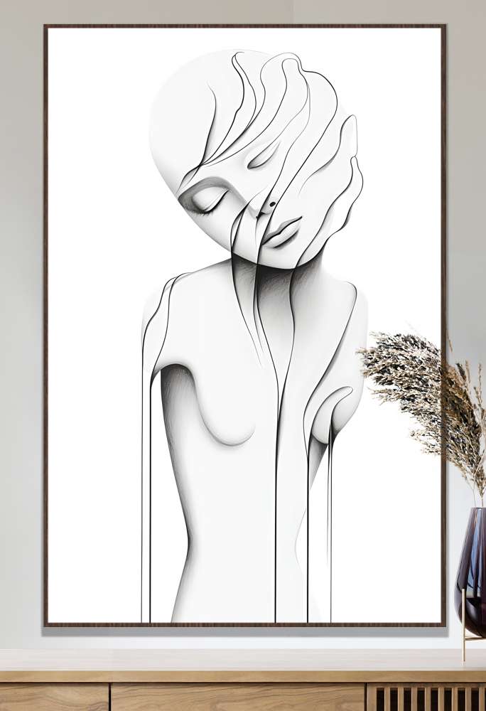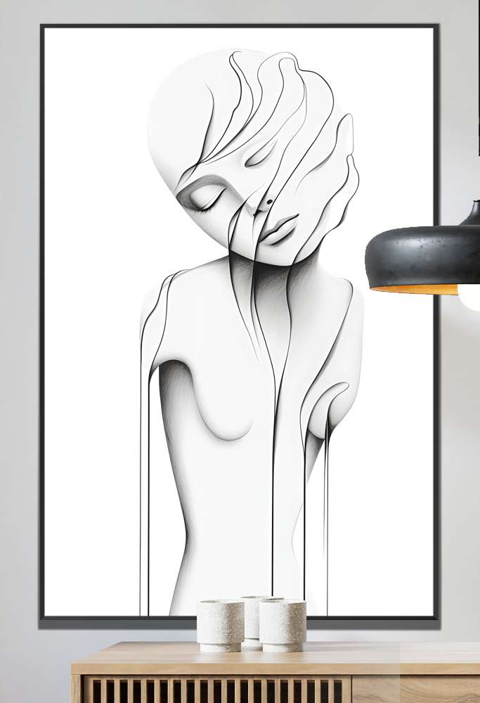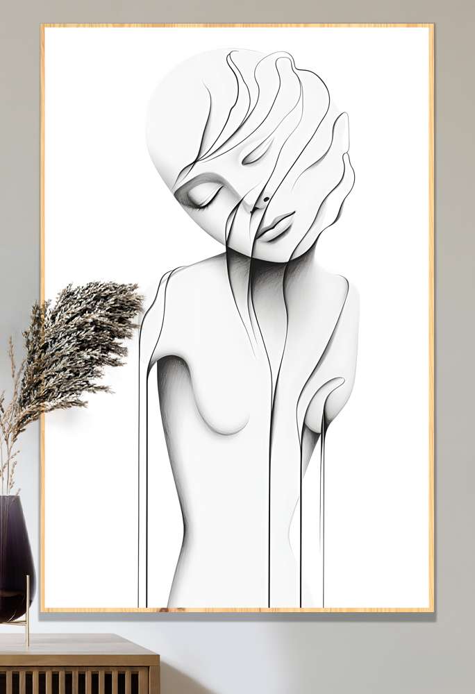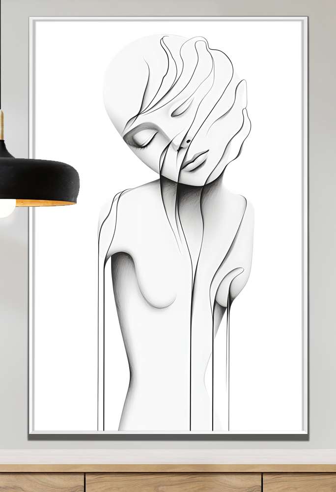 Este quadro decorativo minimalista apresenta um desenho de uma mulher se desfazendo em linhas suaves e fluidas, transmitindo uma sensação de efemeridade e introspecção. Ideal para quem busca uma peça que combine simplicidade e profundidade, perfeita para ambientes sofisticados e contemporâneos. Adicione um toque de elegância ao seu espaço com essa arte única e envolvente.