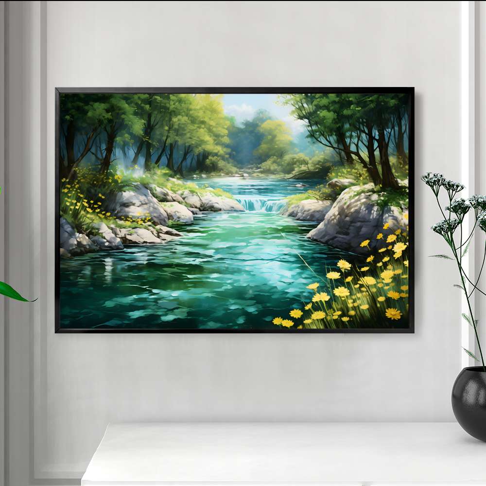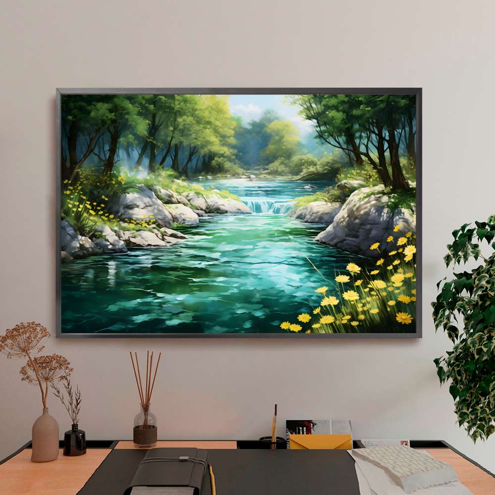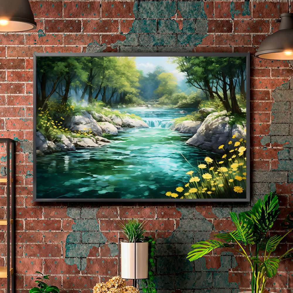 O Quadro Decorativo Paisagem Cachoeira com Águas Cristalinas traz para o seu ambiente toda a magia e serenidade de uma cachoeira de águas cristalinas. A imagem captura a beleza natural desse espetáculo, com tons verde-azulados, flores amarelas e uma vegetação exuberante ao redor. Ideal para quem busca um toque de tranquilidade e conexão com a natureza em sua decoração. Adquira já o seu quadro e transforme seu espaço em um refúgio de paz e beleza.