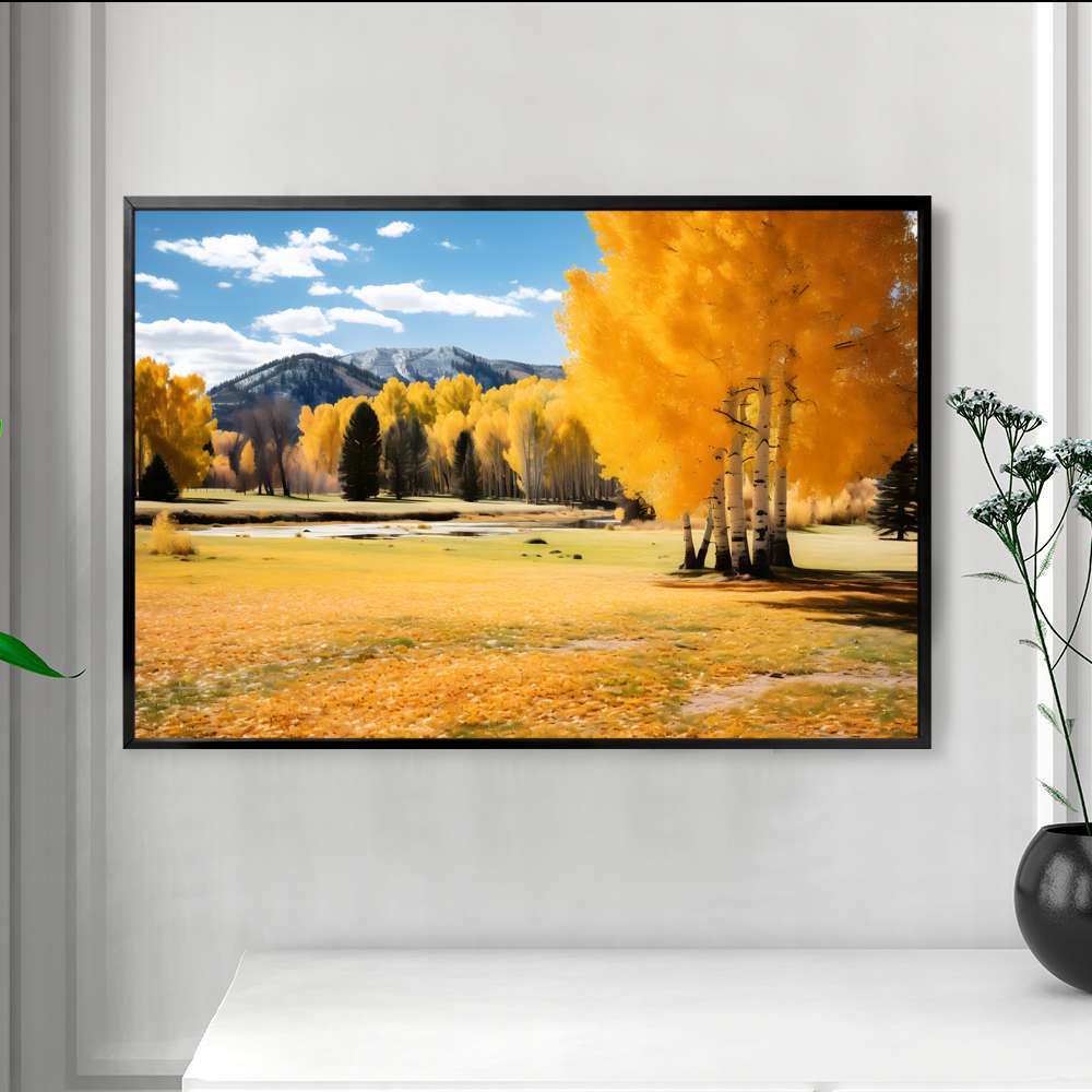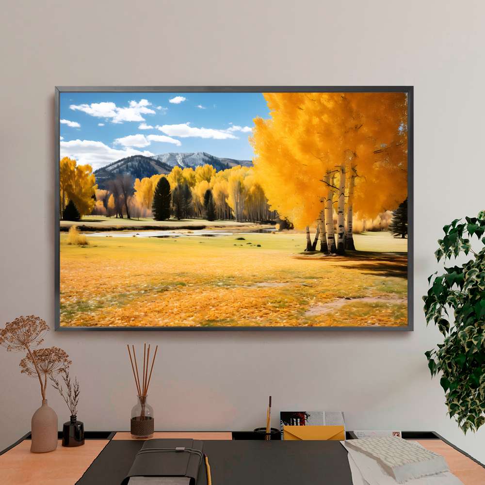 Adicione um toque de serenidade e beleza natural ao seu ambiente com o Quadro Decorativo Paisagem De Árvores na Estação Primavera. Esta imagem deslumbrante captura a exuberância da primavera, com árvores de folhas amarelas e verdejantes em contraste com um céu azul límpido. Um campo em tons de amarelo se estende ao fundo, enquanto montanhas cobertas de vegetação complementam a paisagem, criando uma atmosfera serena e inspiradora. Renove a decoração de sua casa ou escritório com esta obra que traz toda a beleza da natureza para o seu espaço.