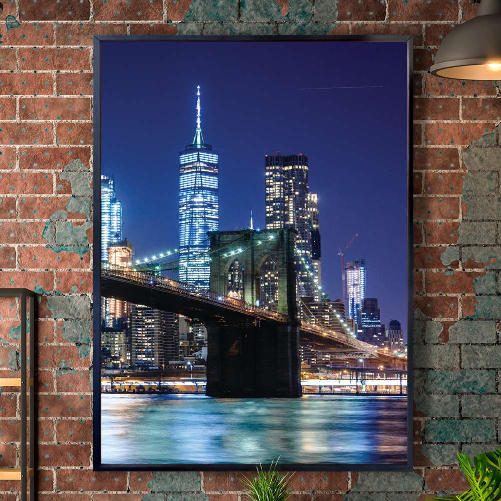 Destaque seu ambiente com o Quadro Decorativo Ponte do Brooklyn iluminando a cidade à noite. A imponente estrutura da ponte, refletida nas águas do East River, traz mistério e minimalismo à sua decoração. Ideal para quem busca um toque moderno e contemporâneo, este quadro evoca a beleza urbana e a energia noturna da cidade de Nova York. Leve para sua casa a atmosfera única da Ponte do Brooklyn e transforme seu espaço em um cenário deslumbrante digno da Big Apple.