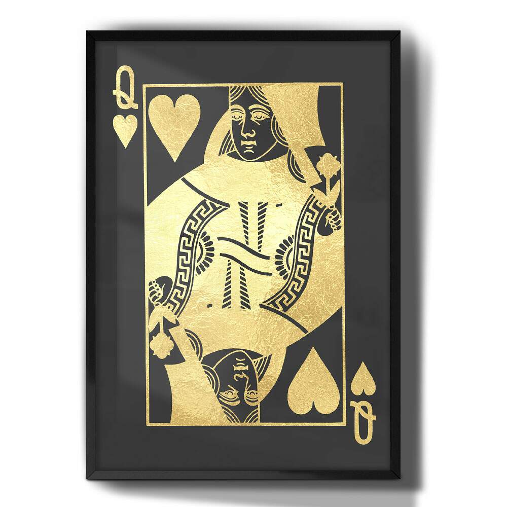 Decoração, quadro decorativo, Rainha de Copas, preto e dourado, jogo de cartas, truco, poker, ambiente aconchegante, elegância, design exclusivo, sofisticação, charme, detalhes em dourado, decoração temática, estilo único, toque de luxo, presente criativo, arte em parede.