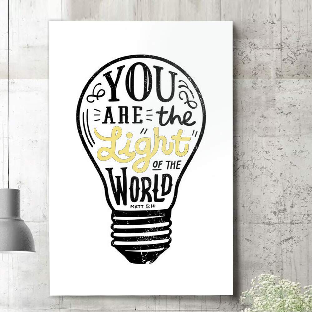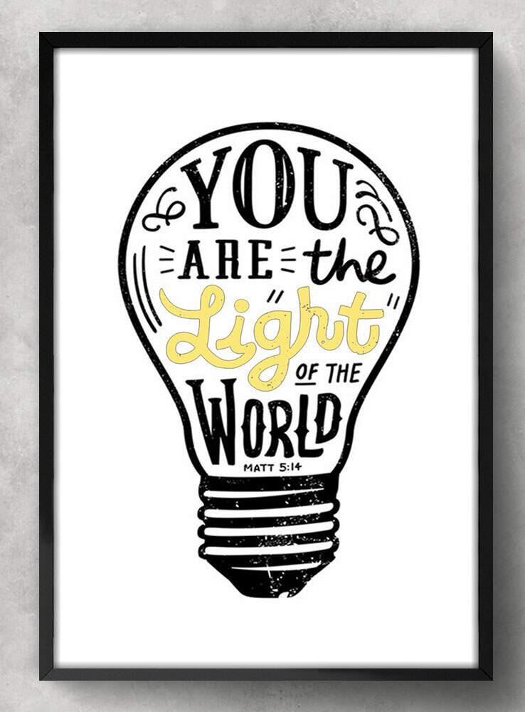 Iluminação, decoração minimalista, religião, quadro decorativo, citação bíblica, mensagem inspiradora. Desperte a luz interior que há em você com o Quadro Decorativo You Are The Light Of The World. Com uma lâmpada estilizada e a inspiradora passagem bíblica de Mateus 5:14, este quadro une a religião com o minimalismo na decoração, trazendo uma mensagem de positividade e iluminação para o seu ambiente. Ideal para quem busca peças únicas com significado e que tragam harmonia ao lar. Permita que sua fé e estilo se manifestem em cada detalhe da sua casa.